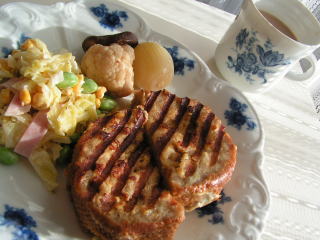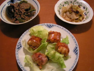 てんきち母ちゃんちの毎日ごはん(2)のレシピです。豚バラ肉で水切りしたお豆腐を包み、ちょこっとカレーパウダーを加えた照り焼きにしてあります。作っている時から、見るからにおいしそうなツヤと匂いお豆腐がとってもクリーミーになって、モッツァレラチーズのようでした(*^_^*)ついでに、プチトマトも巻いて、焼いてみました。煮物も同じ本のレシピで、牛こまにピーマン、なすをあわせたもの。これは張り切って息子が野菜を切ったり、炒めたりを手伝ってくれました。最近は子供用包丁を卒業して、「ママと同じのでやる」と頑張ってます。こっちはかなりヒヤヒヤですが、今は「自分でやってみたい」という気持ちが強く、私が手出しするのを嫌がるので、じっと我慢して見守っています本を見ながら、煮汁の配合もやってました。ただ、分数をまだ習っていなくて、「しょうゆ大さじ1/2」を「大さじ1~2」だと思ったらしく、かなりドバッと入ってしまいましたが・・・(;^_^Aそんなわけでちょっと色黒の煮物です。もう一品はれんこんとさつまいものサラダ。和風の印象の素材の組み合わせですが、オリーブオイルにはちみつやバルサミコ酢を合わせたドレッシングで和えてあるので、そのコントラストがちょっと面白い味になってます。
