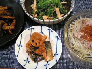 我が家ではあまり登場しない煮魚ですが、さば味噌と銀だらだけは別。両方とも栗原はるみさんのレシピを覚えてから、我が家の定番メニューになりました。生姜のきいた甘辛い味噌ダレがからんださばは、こってりしているけれど、しつこくなくて、食べやすい。たっぷりの煮汁で今日はれんこんも一緒に煮付けました。冬には特においしいな~と思うおかずのひとつです副菜はちまちまとしたおかずを3つ。もやしと豚肉の梅だれは、もやしの上に、豚バラ肉をのせ、たたいた梅干を加えたおしょうゆを回しかけて、レンジでチンしただけなのですが、豚バラのコクのおかげでちゃんと味がまとまってくれます♪そして、小松菜と油揚げのごま和えに、さつまいものきんぴら。大学芋のようなこの甘いきんぴらは、娘の大好物。てんきち母ちゃんちの毎日ごはんのレシピで、多めの油で炒め揚げして、黒糖とおしょうゆを煮からめるだけで、大学芋風の味になるというアイディアおかず。たっぷり作りましたが、娘が食後もちょくちょくつま食いし、帰宅の遅い夫用に取っておいた分まですっかりなくなってしまいましたてんきち母ちゃんちの毎日ごはんてんきち母ちゃんちの毎日ごはん(2)