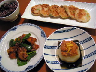 栗原はるみさんの季刊誌 haru_mi 冬号で、おいしそうなふろふき大根の写真を見てから、急にふろふき大根が食べたくなり、たっぷり大根一本丸ごと煮ました。皮を厚めにむき、面取りをし、隠し包丁を入れた大根を下ゆでしてから、昆布とかつおぶしでとった一番だしで、じわじわと味をしみこませるように煮ました。早めに仕上げて、冷まして味をしみこませ、夕食前にもう一度温めていただきました。何気ない煮物も、こうして丁寧に作ると心なしか味も上品で、おいしく仕上がるような・・・(*^_^*)お味噌だけの濃厚な味噌だれよりも、鶏挽き肉の入った肉味噌のほうが子供たちの好みなので、そこは庶民的な路線にアレンジ子供たちもお代わりして大人なみに食べたので、大根1本分を夕食だけで食べきりました♪ふろふき大根は、メインとしてはボリューム不足なので、もう1品お肉のおかずを。豚バラ肉とピーマン、かぼちゃのしょうが焼きです。てんきち母ちゃんちの毎日ごはん(2)を参考にしました。少なめのお肉でも、野菜をたっぷり加えることでボリュームUPするので、目にもお腹にも満足の一皿でした。あとは缶詰のコーンの使い残しがあったので、冷凍枝豆と冷凍むきえびをプラスし、白玉粉を加えて平らなおだんごにして、ごま油でカリカリに焼きました。おやつのような、おつまみのような1品です。今日はご飯を白米に黒米を加えて、炒った黒豆も炊き込んだ黒豆ごはんにしました。見た目は紫色が強烈なインパクトですが、黒豆がホクホク甘くて、かなり美味しい炊き込みご飯と見るや「いらな~い」という反応を示す娘も、これは一口食べてみて「合格!」だったらしく、お代わりして食べてました。今、黒豆はお正月用にたくさん出回っているので、今度は少し上等の黒豆で試してみようかな~。栗原はるみ haru_mi (ハルミ) 2008年 01月号 [雑誌]