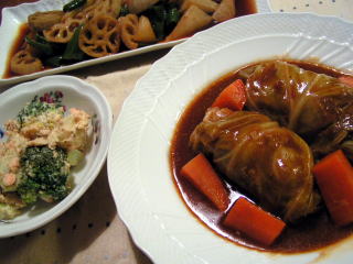 今日はかなり冷え込んだので、キッチンも暖かくなる煮込みモノに。ルク鍋でシチューのように煮込んだロールキャベツです。コンソメスープで軽く煮込んだ後、デミグラスソースの缶詰とトマトペーストを加えて、さらにコトコト煮ることおよそ1時間。シチューのようなロールキャベツの出来上がり♪お肉はもちろんですが、これは味がしみてとろ~んとなったキャベツが美味!葉物野菜はめったに食べない偏食娘もこのキャベツはモグモグ食べてました。サラダはゆでたじゃがいもとブロッコリーを、焼いてほぐした塩鮭入りごまマヨネーズで和えたもの。うちに帰ってから15分で作れる晩ごはんのレシピです。もう1品は、Yomeカフェレシピのれんこんのカレー浸しを参考に、素揚げしたれんこん、ピーマン、大根を揚げ浸しにしたもの。意外ですが、大根は素揚げすると甘くておいしいんです普段は揚げ浸しといえば、めんつゆに漬けることが多いのですが、ウスターソースやケチャップベースの洋風の揚げ浸しもなかなかでしたうちに帰ってから15分でおいしい晩ごはんYomeカフェレシピ
