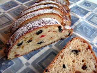 今年はたいてい毎年作っていた、クッキーハウスもパンのリースも作らないまま、とうとうクリスマスになってしまいました。「食べる」のではなく、「飾る」だけのモノに労力をさく余裕がなくて・・・(;^_^Aシュトーレンなら、クリスマス気分を味わいつつ、食べる楽しみもあるし♪と思い立ち、間際になって作りました。うちのシュトーレンは、本格的なずっしりしたものではなく、パン教室で習った、クセのない、軽くて食べやすいタイプ。それでもドライフルーツは粉の50%、バターは25%と普通のパンに比べれば、たっぷり入ってます。生地にはローストしたアーモンドスライスも入っているので、ところどころサクサクと香ばしくもあり、とても気に入っているレシピ焼き上がりにはブランデー、溶かしバター、あんずジャム、粉糖でコーティングしています。久しぶりに食べたら、しっかり甘いのだけれど、やっぱり美味しい~うめはら フルーツミックスD 500gフルーツミックスはやはりコレ!しっとりしていて、フルーツのジューシーさが全然違います。偏食家の娘はここのじゃないと、見向きもしません・・・(T_T)