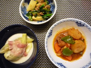 鶏じゃが小松菜と長芋の豚肉あんかけ カレー風味(てんきち母ちゃんちの毎日ごはん(2)より)なすのクリーム煮(おいしいね電子レンジより) * * * * * * * * * * * * *買い物に行かずに作った夕食なので、和洋折衷というか、よくいえば味のバラエティーに富んだ組み合わせになりました(^_^;)メインの鶏じゃがはコチュジャンで味付け。小松菜の煮物は和風の甘辛味+カレーパウダー。なすはベーコンで巻いてから、生クリームとコンソメスープで煮てあります♪