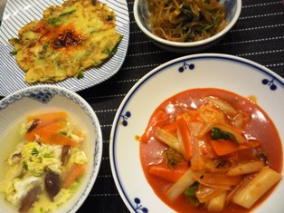 韓国風海苔巻き(僕が韓国料理をつくる理由より)トッポギ&牛肉野菜炒め豆腐チゲ大根の柚子ナムル(僕が韓国料理をつくる理由より) * * * * * * * * * * * * *先日、ネットショップで韓国料理食材をいろいろ購入したので、今日は韓国風の献立にしてみました(^^♪海苔巻きは、本物を食べたことがないので、レシピ本を見ながらこんなんでいいのかな~?と悩みつつ作りました。濃い目に味付けした牛肉、ナムル風のにんじんとほうれん草、スクランブルエッグ状にした卵を巻いてあります。日本の海苔巻きと比べるとずい分大胆な(?)具なのですが、これはこれで美味しかったです。味がついているので、お醤油不要。お弁当にもよさそうですトッポギはチーズの入っていないごく普通のものを使用。硬めのお餅なので、煮るよりも炒めたほうがおいしくいただけました。チゲスープの素も買ってみたので、もやしやお豆腐、じゃがいもを加えて豆腐チゲに。指定の濃さの3倍くらい水の量を増やして薄めたのですが、それでも我が家には辛かった!本場の辛さにはとても耐えられそうにないです柚子の絞り汁と柚子の皮を加えて作るナムル。口の中がさっぱりするので、辛いもの、味の濃いもののお供には相性バッチリでした。簡単チゲ鍋スープ 純豆腐鍋(スンドゥブチゲ)の素 150gトッポキ・トッポギ楽園トッポギ 460g