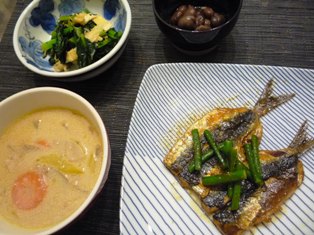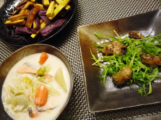 鮭の粕汁牡蠣のしょうゆ焼きさつまいもの素揚げ * * * * * * * * * * * * *お正月はあまり動かないわりに、食べ物が豪華なので、やはりかなりのカロリーオーバー(+o+)帰宅後は野菜たっぷりの粕汁にしました。野菜は夫の実家の自家菜園で採れたものをたくさん持ちかえってきたので、まだ年始で高い野菜を買わずにすみました(^_^)