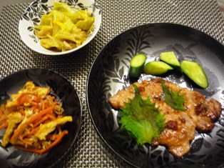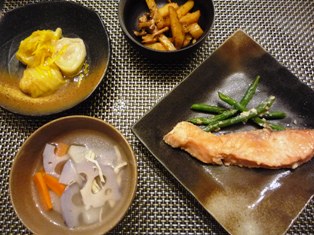 豚肉の梅しそ焼きにんじんとしらたきの卵炒めキャベツとツナの生姜煮 * * * * * * * * * * * * *れんこんはさみ揚げほうれん草と桜エビ入り卵焼きじゃがいものバター醤油炒め * * * * * * * * * * * * *