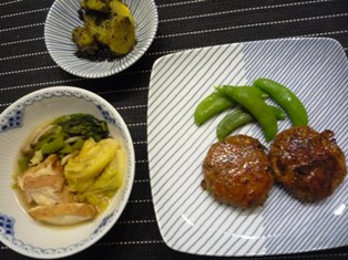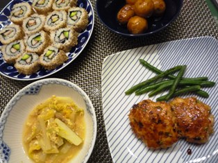 しそ入りつくね(もてなし上手より)裏巻き寿司(私の贈りものより)新じゃがの甘辛煮(ぜ~んぶ加圧は5分以内!圧力鍋でスグでき!人気おかずより)白菜の卵とじ(栗原はるみさんレシピ) * * * * * * * * * * * * *裏巻き寿司はかにかま&アボカド&きゅうり&しその組み合わせです。マヨネーズも少し絞って巻いています。裏巻きは、巻簾だけでなく、クッキングシートも使うとくっつかずに巻けます♪不器用な娘には、普通の海苔巻きよりも裏巻きの方が海苔がひきちぎれずにバラバラになる・・・ということもなく、食べやすいようです。新じゃがは皮ごと使っています。皮の部分が香ばしくて、普通のじゃがいもの煮物とはひと味違った味わいに(^o^) * * * * * * * * * * * * *昨日の雪の影響で、急遽娘の学校の始業時間が1時間遅くなりました。いつもよりも1時間遅くスクールバスのバス停に送って行ったのですが、予定時刻を過ぎても一向にバスが来ない・・・そのうち携帯に連絡が入り、交通渋滞で30分は遅れるとのこと。しかし、その後も来る気配は全くなく、あまりに寒かったので、(地面はまだ雪が残っていたし、氷が張っているいるところも・・・)近所のコンビニでお手洗いを借りつつ、ひたすら待ちました。ようやくバスが来たのは、日射しも高くなり、雪も溶けてきた10時過ぎ\(◎o◎)/!寒空の下、実に1時間半待ち続けました(+o+)それほどひどい渋滞だったようです。午前中、ほぼ何もしていないのに、どっぷり疲れた一日でした