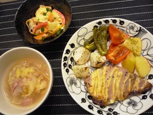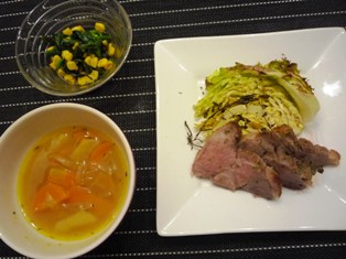 ハーブ風味のローストポーク&キャベツ(ようこそ、私のキッチンへより)ほうれん草とコーンのはちみつレモン和え薄切り野菜のスープ(有元葉子さんレシピ) * * * * * * * * * * * * *