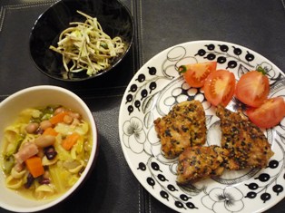 鶏肉のごまソテー(簡単&便利なYOMEちゃんの使いまわしレシピより)豆入りミネストローネごぼうときゅうり、セロリの味噌マヨ和え * * * * * * * * * * * * *鶏肉はルク鍋で蒸し煮にしてから、下味をつけ、小麦粉と卵をまぶし、ごまをたっぷりつけてソテーしています。火が通っているので、表面をさっと焼きつけるだけでOK。蒸し汁はミネストローネに使い回しました(^_^)そして、食事中に焼きあがったほうれん草とブロックベーコンのキッシュたかこ@caramel milk teaさんのデリごはんとカフェデザートのレシピを参考にしています。食べきりサイズで、具も控えめなので、メインがほかにある時にはちょうどいい感じです。【送料無料】たかこ@caramel milk teaさんのデリごはんとカフェデザートのレシピ【送料無料】簡単&便利なYOMEちゃんの使いまわしレシピ