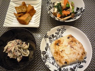 かじきまぐろの塩麹焼き小松菜と鶏酒蒸しのポン酢和え厚揚げのごま煮(もう一度、ごちそうさまがききたくて。より)大根とかにかま、ひじきのごまマヨネーズ * * * * * * * * * * * * *すっかりお気に入りとなった塩麹焼き。今日はかじきまぐろを漬けてみました。ぶりやサーモンはとてもおいしかったのですが、かじきまぐろは脂が少ないので、パサついてしまいました(+o+)上等な生かじきで作ればまた違ったのかもしれませんが、解凍モノではダメだったようです・・・(T_T)厚揚げのごま煮は栗原はるみさんレシピ。豆板醤でピリッと味を締めるのがポイントです♪子供たちの大好物で、翌日のお弁当に入れようと思うのだけど、いつもその日の夕食でなくなってしまう売れっ子です♪豚肉のチーズ巻き(てんきち母ちゃんちの朝15分でお弁当より)春雨ときゅうり、ハムのサラダかぼちゃといんげんの煮物 * * * * * * * * * * * * *