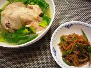 サムゲタン(圧力鍋のもっと絶品おかずより)チャプチェ * * * * * * * * * * * * *ひと駅隣のスーパーに寄ったら、クリスマスの時期でなくても、丸鶏が売っていました。やや小ぶりで、少食の我が家でも食べきれそう!と思って購入圧力鍋を使ってサムゲタンにしました。お腹にはもち米、甘栗が入っています。なつめは今回入手できなかったので、省略。味付けはにんにくと生姜とお塩だけです。青梗菜は仕上げの段階で加えました。圧力鍋で1時間近く加圧したので、お肉はお箸で触っただけで骨から外れます♪ほろほろのお肉はもちろん、鶏の旨みがたっぷり出たスープもまた美味しい!温まりました!(^^)!チャプチェは今回初めて韓国春雨(タンミョン)を使ってみました。半年ほど前からNHKのハングル講座を見ているのですが、その中で紹介されていた本格派のチャプチェが本当においしそうでぜひともこのレシピで作りたい!と思って、普段は緑雨春雨で作るところ、今回はタンミョンを使用。春雨よりもずいぶん太く、葛切りのような見た目でしたが、食感はもちもちで食べ応えがありました。今までは、春雨が水分を吸収してしまって、わりとパサついた感じになっていたのですが、タンミョンは太さがある分、それ自体に水分をしっかり含んでいて、具と合わせてもみずみずしさが残ります。今までのチャプチェとは全く別のおかずになって、感動~これからはこのレシピで行こう!さっそくネットショップでタンミョンをまとめ買いしました。《ユウキ食品》韓国春雨(タンミョン)【100g】私がスーパーで買ったのはこれですが、少々割高。お試しで使ってみるのなら、使い切りサイズでちょうどいいです。韓国はるさめでチャプチェを作ろう!太くてコシがあるサツマイモ澱粉の春雨です。オットゥギ 昔の春雨 500g韓国春雨・韓国食品ネットで買ったのはこちら。5倍の量が入って、お値段は2倍弱♪