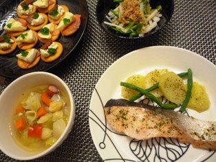 サーモンのハーブオイルマリネ焼き(ようこそ、私のキッチンへより)大根と春菊のサラダミネストローネカナッペ2種 * * * * * * * * * * * * *丸鶏を買ったスーパーで脂ののったキングサーモンも発見!近所のスーパーでは扱ってはいても、けっこう値の張るものなので、フツーの鮭の切り身なみのお値段で買えてラッキーでした(^_^)v脂身たっぷりで、ソテーしてもパサパサしなさそうだったので、オリーブオイル&ローズマリーやタイムなどのハーブ&粗塩に漬けこんでオーブン焼きにしてみました。ジューシーでおいしかった!大根と春菊はいずれも生のまま。春菊はやわらかい葉先を使っています。市販のフライドオニオンをたっぷりかけ、お醤油系のドレッシングをかけました。カナッペはひとつはクリームチーズにイタリアンハーブミックスやローストガーリックを練り込んだ自家製ハーブチーズと夫実家からもらった台湾土産のカラスミの組み合わせ。もうひとつは定番カマンベール&スモークサーモンです。残ったカマンベールチーズは翌朝のトーストに。パンはグラハム粉の入った生地にドライいちじくを加えたもの。素朴な味わいながら、ところどころいちじくの甘みとねっとりした食感が楽しめます。チーズとの相性もバッチリトーストした後、はちみつをまわしかけていただきます♪もう一枚は、オーストラリアで買ったレモンバターを試してみました。しっかり酸味が効いていて、とろみの少ないレモンジャムのような感じ。甘さも控えめで大人向きのスプレッドです(^^♪お昼はかき揚げうどん。かき揚げは豚肉+ごぼうバージョンと玉ねぎ+にんじん+三つ葉+桜エビバージョン。好きなものをトッピングして食べる形式にしたら、息子はお肉派、娘は玉ねぎ派と見事に好みが分かれました
