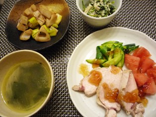 鶏むね肉の蒸し焼き(てんきち母ちゃんのあっという間のおかずより)れんこんとセロリのきんぴら(栗原はるみさんレシピ)ほうれん草とエリンギの白和えわかめスープ * * * * * * * * * * * * *レシピではフライパンを使っていましたが、うちのフライパンはあまり厚手ではないので、パサパサになると困るので、ルク鍋を使いました。表裏で5分くらい焼きつけた後は、フタをして冷めるまで放置。水分を加えなくても、鶏肉からたっぷり蒸し汁がでます。蒸し汁に浸った状態で冷ますので、むね肉とは思えないくらいジューシーでやわらか(^o^)かたまり肉をほとんど食べない娘にもOKでした市販のジュレポン酢でいただきました。わかめスープは鶏から出た蒸し汁に鶏ガラスープを加えて作ったもの。セロリの葉っぱに近い部分も加えると、具はシンプルでも香りよく仕上がります♪