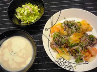 豚ヒレ肉のソテー バルサミコソース(有元葉子さんレシピ)かぶのクリームスープコールスロー * * * * * * * * * * * * *豚ヒレ肉をソテーし、バルサミコ酢やお醤油、バターを合わせたソースをかけてあります。付け合わせはナムル風のにんじんと大根の常備菜にブロッコリースプラウト。かぶはにんにくとベーコンのみじん切りと一緒にバターで炒めて、コンソメスープで煮た後、ミキサーで撹拌し、お鍋に戻して牛乳を加えて温めて完成♪今日は生クリームがあったので、仕上げに少し加えました。冬は少しこってりしたスープもおいしく感じられます(^_^)