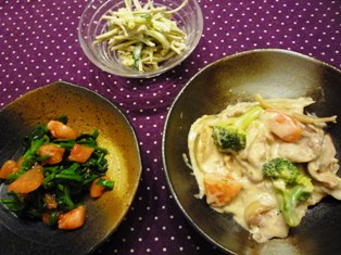 豚肉のクリーム煮ごぼうときゅうりの味噌マヨサラダほうれん草とトマトのはちみつドレッシング和え * * * * * * * * * * * * *