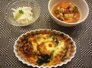 照り焼きチキンとほうれん草のグラタン(栗原はるみさんレシピ)塩麹のミネストローネ(麹と酒粕のおいしい食卓より)大根とセロリのサラダ * * * * * * * * * * * * *鶏肉を照り焼きにして、ゆでたほうれん草、しめじと合わせて、玉ねぎ入りのホワイトソースをかけ、ピザ用チーズをたっぷり。お醤油味の鶏肉が少し和風な感じですが、不思議とホワイトソースともいいバランスでしたミネストローネはコンソメを使わずに、塩麹だけで味付けしています。すっきりした味で、こってりグラタンにもよく合いました。久しぶりにこってり味のスパゲッティです。ときどき無性に食べたくなるカルボナーラ(●^o^●)厚切りベーコンと生クリーム、卵黄がたっぷりカロリーを考えると恐ろしいのですが、少~し食べる分にはとってもおいしい!野菜がまったく入らないパスタなので、新玉ねぎのサラダを添えました。