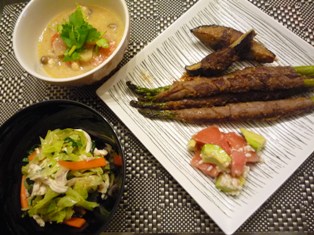 アスパラガスの牛肉味噌焼き(YOMEの楽チン・レシピ(2)より)トマトとアボカドの塩麹和え(毎日がたのしくなる塩麹のおかずより)キャベツとニラ、にんじんのナムル(オレンジページレシピより)醤油味の豚粕汁(麹と酒粕のおいしい食卓より) * * * * * * * * * * * * *今が旬のアスパラガス私はとても好きなのですが、子供たち(←特に息子)は苦手。でもこのように牛肉を巻いてこってり甘味噌味に仕立てると、多少は食べやすかったようです。「これだったら、なんとかいける・・・」とつぶやいてました。付け合わせは、トマトとアボカドを塩麹と少々の酢で和えただけですが、まろやかで食べやすい和え物になりました。トマトだけをよって食べるかな・・・と思っていた娘もアボカドまで完食(*^_^*)ナムルは鶏の酒蒸しが入るので、味付けはごま油と薄口醤油のみで十分でした。濃い味のメインにはぴったり。野菜はゆでてあるので、たっぷり食べられます。豚汁は味噌仕立てが多いですが、これはお醤油仕立て。酒粕が入るので、コクと旨みがプラスされ、お味噌が入らなくてもおいしくいただけました。【送料無料】麹と酒粕のおいしい食卓塩麹のレシピ本はたくさん出ていますが、我が家で一番活用頻度が高いのはコレ!酒粕レシピも充実しています(*^_^*)【送料無料】毎日おいしい 麹と酒粕のお菓子とパン(仮)「麹と酒粕のおいしい食卓」と同じ小田真規子さんの新刊。パンがとてもおいしかったので、この本にも期待しています