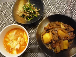 コチュジャン焼き肉&サンチュ(オレンジページレシピより)せりとぜんまい、もやしのナムル根菜のスープ * * * * * * * * * * * * *牛肉は切り落としなどはスーパーで買うこともありますが、たいていは毎月届けてもらっているシュガーレディーのビーフを使っています。カナダ産ですが、ジューシーでとても美味しい!今日はそのシュガーレディーのカルビ肉を使って焼き肉風のおかずに。焼き肉をしても、アラフォー夫婦はもちろん、食べざかりのはずの中学生の息子も「脂っこくて量が食べられない」と言うので、おいしいお肉を少しだけいただくスタイルに^^;(ほぼベジタリアンな娘は焼き肉にすると野菜しか食べないし)コチュジャンやお砂糖、お醤油などに漬けこんだお肉を玉ねぎ、にんにくの茎と一緒に炒めただけですが、甘辛加減がちょうどよくて、思わず「おお!」と我が家のツボにくるレシピでした。ナムルは春らしく、せりをたっぷり使いました。今回、初めてぜんまいを加えてみましたが、食感も味も、いいアクセントになってくれて、今まで山菜は私があまり得意ではなく、ほとんど使ってこなかった食材なのですが、これなら克服できそうです。