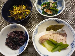 ぶりのスープ煮(オレンジページサイトより)ごぼうのカレー風味きんぴら(朝つめるだけ!楽ラクお弁当bookより)春菊と豚しゃぶのジュレポン酢和え黒豆入り黒米ごはん(栗原はるみさんレシピ) * * * * * * * * * * * * *塩をしてから熱湯をかけて下処理をしたぶりを塩麹ベースのスープで軽く煮ています。にんにくやローリエを加えたあっさりした洋風スープ煮。じゃがいもも一緒に煮込みました。ごぼうはささがきにして炒めてカレーパウダーとマヨネーズで調味。コーンも加えて、こちらも洋風な味付けに。春菊は豚しゃぶ肉と和えるのが子供たちにも抵抗のない食べ方のようです。普通のお浸しではなかなか箸が進みませんが、こうするととても食べやすい模様♪黒豆ごはんはギョッとする色合いですが、炒ってから加える黒豆がとーっても甘くてホクホクしていて、美味甘煮以外では一番お気に入りの黒豆の食べ方です(*^_^*)娘の給食エプロンをもう一枚新調しました。生地が足りなくて、手持ちの生地の中から合いそうなものを組み合わせて作成^^;マジックテープがついているのは、そこで一旦前に持ってきた紐を仮止めするためです。これは担任の先生のアイディア。紐を持ちながら結ぶという作業を並行するのは、娘には難しいらしいのですが、仮止めしてあれば、ゆっくりと自分のお腹の前でひも結びをすることに集中できるようです