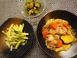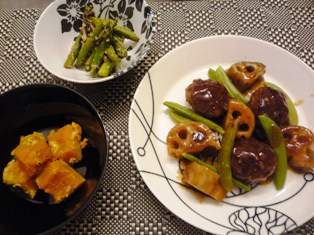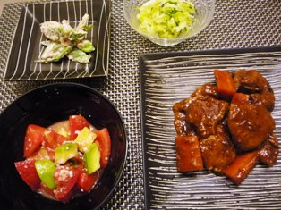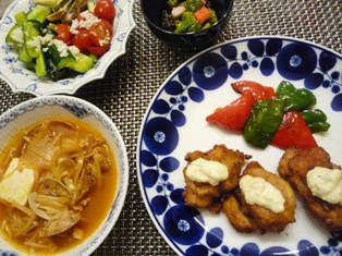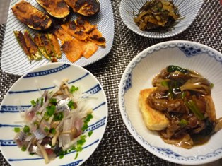 いわしの酢締めサラダ(栗原はるみさんレシピより)豆腐のステーキ肉あんかけ(おいしくたべよう。より)れんこんと糸昆布のきんぴら(私の贈りものより)野菜の酒粕みそ焼き(麹と酒粕のおいしい食卓より) * * * * * * * * * * * * *お刺身用のいわしが手に入ったので、酢締めにしました。三枚におろして塩をして、水気を拭いてからカンタンいろいろ使えま酢に漬けました。漬けこんだ後、皮をはいで出来上がり。千切りにした大根とゆでたしめじと合わせてサラダにしました。酢の物好きの娘がとっても気に入って食べていました。ほんのり甘みがあって、酢がきつくないので食べやすいようです。豆腐をたっぷり2丁使った豆腐ステーキです。弱火でじっくりそれぞれの面をカリッと焼き、牛肉と舞茸、小松菜入りのとろみのある甘辛いたれをかけて完成ごく普通の材料で、ごく普通の味付けなのに、とてもおいしくできるのが嬉しい酒粕とお味噌をみりんで伸ばした味噌だれをオクラ、にんじん、なすに塗り、オーブンで焼いたもの。油断していたら、焦げ焦げになってしまいました(+o+)これは味噌+酒粕よりも、味噌+チーズのほうがおいしかったな~。