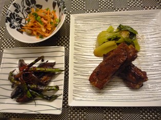 スペアリブの中華風煮込み&青梗菜(「ストウブ」のおいしい使いこなしレシピより)なすといんげんのテンメンジャン炒めにんじんとしめじの明太子炒め * * * * * * * * * * * * *スペアリブを五香粉やオイスターソースに漬けこんでから、ストウブで煮込んでいます。このお鍋だとほぼ素材の水分だけで煮込みOK。余計な水分を足さずに済み、素材の味がしっかり出てくれます♪なすといんげんは炒めてからテンメジャンとお砂糖、お醤油で味付け。本当はそれぞれ素揚げしてからのほうがおいしいのですが、今日は簡略形で。にんじんは千切りにして、しめじと炒め合わせ、明太子と薄口醤油で味付け。本日のお弁当。照り焼きにしてから冷凍保存してあった鶏肉がメインです。あとはゆでっぱなしのじゃがいもとさやいんげん。野菜の酒粕あえにごぼうのカレーきんぴら。【送料無料】「ストウブ」のおいしい使いこなしレシピ