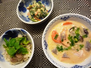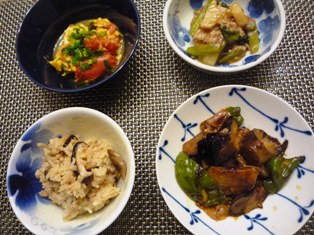 酒粕と鶏ひき肉、きのこの炊き込みごはん(麹と酒粕のおいしい食卓より)トマトと卵の塩麹炒め( 〃 )なすとピーマンのキムチチーズ炒め(てんきち母ちゃんちの毎日ごはん(2)より)長芋と小松菜のカレーあんかけ( 〃 ) * * * * * * * * * * * * *酒粕をちぎってお米の上に散らし、味付けした鶏ひき肉、きのこ類を並べて炊いています。酒粕を炊き込むのは初めてだったので、いったいどんな味になるのか不思議でしたが、とても風味がよく、お肉の臭みも取れるし、バッチリでしたあとはなんとなく冷蔵庫にある野菜を順番に使っていったので、まとまりのない献立です(*_*;炒め物が重なってしまったし・・・。トマトの炒め物は作り置きの塩麹大葉オイルを使って、さっと炒めたもの。大葉の香りと塩麹の旨みがポイントになって、なんてことない炒め物なのに、おいしくできました♪