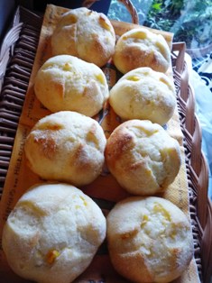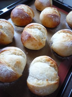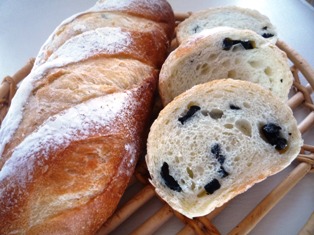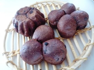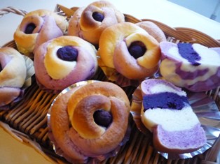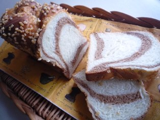 藤田千秋さんのレシピです。紫芋パウダーとお砂糖、バターで紫芋あんを作り、プレーン生地と紫芋生地とを交互に巻いて成型。レシピ本の写真だとバラの花のようにキレイなのですが、どうも私が作ると丸っこくてこれはナニ?というカタチに・・・(+o+)真ん中の濃い紫色の部分が紫芋あんになっています。あんもいいアクセントではあるのですが、このパンは生地自体がとってもおいしい。ちょっとした配合の加減なのだろうけれど、レシピを考える人ってすごいなーと思います。柔らかいけれどもふわふわすぎず、適度にしっとりしていて、そのまま食べてもパサつくことなく、菓子パンの理想の生地