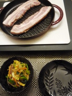 豚バラかたまり肉を白ワインと塩麹に漬け込んでおき、ストウブのグリルパンで脂を落としながら焼きます。サムギョプサルのお供。ゆでキャベツ、さきいかのコチュジャン和え、キムチ、しそ(エゴマの代用)、きゅうり、もやしのナムル、長ねぎのヤンミョン和え。そのままでは脂っこいので、サンチュに包み、お好みの野菜をのせて一緒にいただきます♪あとは、小松菜、にんじん、玉ねぎ、卵、ピーマンの入ったチャプチェも。娘のプールの帰りに寄ったお店で見つけたラム肉。しかもお安い!豚肉とは合わないけれど、せっかくなので買って帰りました。ジンギスカンのたれを作る余裕がなかったので、塩麹を揉みこんで焼きました。息子はバラ肉よりもこちらのほうが気に入っていました。(←食べざかりのくせに、脂っこいものが苦手・・・(*_*;)