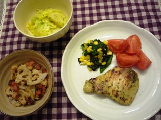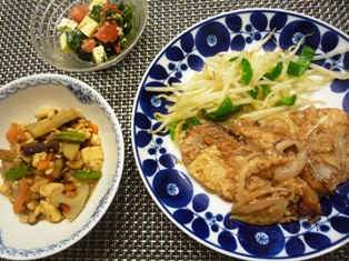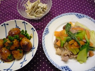 豚肉と野菜の塩麹炒め新じゃがの煮物ごぼうと鶏酒蒸しのごまマヨサラダ * * * * * * * * * * * * *夫、飲み会につき、お手軽晩ごはん(^o^)朝から塩麹に漬け込んでおいた豚肉と青梗菜、にんじんと生姜を炒め合わせました。新じゃがは皮つきのままバターで炒め、お醤油やはちみつ、お酒、だし汁を合わせた煮汁を加え、圧力鍋で5分ほど加圧。あとはフタをとって煮汁を煮詰めていけば出来上がり。簡単でおいしい煮物です。味がしっかりつくので、お弁当にもぴったり。牛肉と野菜のバルサミコ炒めほうれん草とにんじん入りだし巻き卵枝豆 * * * * * * * * * * * * *