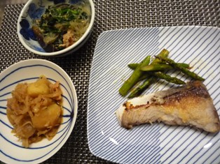 ぶりの塩麹焼き&アスパラ切り干し大根とじゃがいもの煮物(てんきち母ちゃんちの毎日ごはんより)なすとニラ、春雨の炒め煮(てんきち母ちゃんブログより) * * * * * * * * * * * * *2日間自家製塩麹に漬け込んだぶりをこびりつかないホイルシートを敷いたフライパンで焼きました。魚焼きグリルでもいいのでしょうが、塩麹はとにかく焦げやすいので、無理をせず、ラクな方法で(^_^;)スーパーのごくフツーのぶりも塩麹だととてもおいしくいただけます♪メインがお魚の日は少しボリュームのある副菜にしています。味だしのベーコンが入った切り干し大根の煮物は娘の大好物。お鍋に入っている段階からのぞきに来て、「よしよし(^◇^)」という感じで、スタンバイしていますなすのほうは味だしに豚しゃぶ肉を。なんてことないおかずなのですが、味のしみた春雨もまた美味。