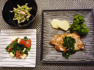 かじきまぐろのバジルソテー&ほうれん草とコーンのソテー、フルーツトマトれんこんのきんぴらタイム風味キャベツとじゃがいもの大葉塩麹オイル和え * * * * * * * * * * * * *400gの乾燥麹から起こした大量の塩麹があるので、当分の間、品薄を気にせず、思う存分塩麹をお料理に使えます(*^_^*)今日はきんぴらの味付けとほうれん草のソテーにも使いました。大葉とにんにく、オリーブオイルと合わせてミキサーで作る塩麹大葉オイルもストック。前回はあっという間になくなってしまったので、今回はこれでぜひパスタを作りたい!鶏肉のコチュジャン大葉チーズはさみ焼きせりとぜんまい、もやしのナムルなすとピーマンのテンメンジャン炒め * * * * * * * * * * * * *鶏もも肉にコチュジャンを塗り、大葉とスライスチーズを挟んで焼きました。日経新聞の日曜版に出ていたアイディアを拝借しました。冷めてもおいしく食べられる味付けです今日は友人と隣市のショッピングモールにできたNatural Kitchenに行ってきました。今まで都内まで出掛けなければいけなかったので、近くにオープンして嬉しい~ オープンしたてとあって、かなりの混雑でレジも10分くらい並びましたが、いろいろと満足のいくお買い物ができましたこれは全部そのNatural Kitchenで購入した材料で作ったもの。リースの土台も含めて、総額600円で完成(*^_^*)手芸道具を引っ張り出してきたついでに、先日買ったAnasuiの携帯用ブラシもスワロフスキーでデコってみました アナスイ★ヘアブラッシュP (折りたたみ式ヘアブラシ)ラインストーン(スワロフスキー)(2.6ミリ)
