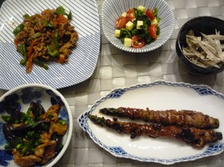アスパラの甘味噌焼き(YOMEの楽チン・レシピ(2)より)牛肉のプルコギ風炒めなすと豚バラ肉の梅ポンガーリック(てんきち母ちゃんちの毎日ごはん(2)より)ほうれん草とプチトマト、プロセスチーズの塩麹和えごぼうサラダ * * * * * * * * * * * * *大人のメインはアスパラに牛肉を巻いて焼きつけ、甘みそ味に仕上げたもの。子供たちは二人ともアスパラがイマイチ苦手なので、同じような味付けで、牛肉+にんじん、玉ねぎ、ピーマンを炒め合わせたプルコギ風のおかずに。鶏肉の味噌漬け焼き厚揚げといんげんのごま煮新じゃがの甘辛煮プチトマトの塩麹マリネオレンジ * * * * * * * * * * * * *今日は娘の遠足の日!それなのに、朝から思いっきり雨水族館なので、雨天決行とは聞いていたけれど、最初から雨具を準備して、出掛けるのはなんだか可哀想(*_*;新学期になってから、給食の食べ残しが多いようなので、お弁当は娘の好きなものばかりを詰めました。