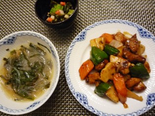 酢豚オクラとかにかま、わかめの酢物にらと春雨のスープ(若林三弥子の蒸しいため完全マスター より) * * * * * * * * * * * * *