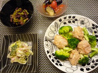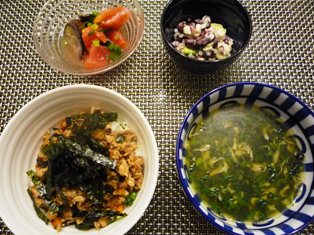 さばのそぼろ丼(ごちそうさまが、ききたくて。より)モロヘイヤのガーリックスープ(小林カツ代さんレシピ)いんげんとキドニービーンズの蒸しいためサラダ(若林三弥子の蒸しいため完全マスターより)なすとトマトの蒸しいため( 〃 ) * * * * * * * * * * * * *朝から出掛けたので、作り置きしておいたさばそぼろで簡単晩ごはん。息子もまだ合宿中でいないので、野菜中心のヘルシー系献立です♪