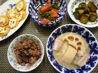 塩麹豚とれんこんの煮込み(「ル・クルーゼ」で、おいしい和食より)ほうれん草とトマトの醤油麹和え(塩麹&麹レシピより)かぼちゃとなすの蒸しいため(若林三弥子の蒸しいため完全マスターより)チーズカナッペお赤飯 * * * * * * * * * * * * *季節感無視の献立です^^;テニス帰りによく立ち寄る隣駅のスーパーはお野菜がとても安い!季節はずれのれんこんもお買い得価格なので、れんこんラブな我が家にはありがたいお店です(^^♪塩麹に漬けこんだ豚バラ肉とごろんと切っただけのれんこん、たっぷりの長ねぎを合わせて煮込みました。塩麹豚のおかげで、味付けはほとんど必要なし。ほんのり甘くてスープまでしっかり飲み干せます今回初めて醤油麹に挑戦してみました。乾燥麹と醤油を室温において発酵させるだけ。今の時期だと3日くらいで完成します。とても香りがよく、そのままごはんやお豆腐にのっけても美味しそう今日はゆでたほうれん草とトマトを和えてみました。なすとかぼちゃの蒸しいためはこの夏のヒットおかず。このためにグレープシードオイルを買いましたハーブ入りのクリームチーズとブルサンが残っていたので、カナッペにしました。トップにはレッドペッパーやグリーンペッパーをのせてアクセントに。塩麹あんを作るためにゆでた小豆を少し取り置き、久しぶりにお赤飯にしました。明日は娘がお弁当持ちの日なのですが、最近お弁当では白いご飯を食べなくなってしまったので、お赤飯にしてみました。わが家のお赤飯はうるち米ともち米を半々にして炊いています。シンガポールで娘が気に入っていたミーゴレン。レシピを検索し、似たような味になるように作ってみました。・・・が、やはり似て非なるモノに(+o+)そもそも麺が米粉を使ったもちもちの平麺だし、味付けのポイントのデーツを使ったナントカソースがないしオイスターソースやおたふくソースを使って甘みを調整してみましたが、別物でした。案の定、娘はちょっと食べて「これは違う」とばかりにプイ・・・と空気を読んだり、気を使ったりしない自閉娘の反応は常に正直でしたシンガポールは海鮮類がとてもおいしくて、シーフードはあまり積極的に食べない息子まで「このエビおいしいね!」と言っていたくらい。今回は少し大ぶりのエビに片栗粉と卵白をもみこみ、低温で油通しをして、丁寧に下ごしらえをしてみました。「今日のエビはおいしい!」と息子の反応も正直でした^^;話題の万能調味料「塩麹」などをご家庭で作れます!米麹 (乾燥米こうじ 板麹) 200g板づくりインドミー ミーゴレン 80gカルディで扱いがあるみたいなので、今度お店を見に行ってきます!
