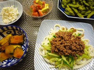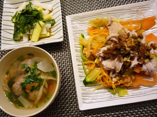 冷しゃぶサラダ(オレンジページレシピより)いわしのつみれ汁(YOMEの基本のおかずアレンジおかずより)長芋とズッキーニの蒸しいため(若林三弥子の蒸しいため完全マスターより) * * * * * * * * * * * * *野菜たっぷりの冷しゃぶサラダです。ピーラーでスライスしたにんじん、セロリ、きゅうりのほか、スライサーでカットした生のかぼちゃも入っています。ドレッシングはザーサイがポイントで、長ねぎ、生姜のみじん切り、ごま油、お醤油などを合わせています。パンチがきいているので、お肉が控えめでも野菜がたっぷり食べられます♪いわしは7尾分を手開きにして、フープロにかけて作りました。野菜はごぼうと大根、にんじんを入れています。長芋とズッキーニは、ともにあまり調理方法のバリエーションが乏しい野菜なのですが、これはなかなかのヒットでした蒸しいためをした長芋とズッキーニは味がぼけず、ポン酢と大葉をかけただけで十分な美味しさ。娘がとても気に入っておかわりして食べていました。昨日ようやく合宿から帰宅した息子。予想通り、真ーーーっ黒になってました日焼け止めも持たせたのですが、塗り直したりするマメさは持ち合わせてなかったらしく、ほぼ役目は果たさなかった模様それなのに、今日も友達がコートを取ったからと言って、朝からテニスへ・・・(+o+)屋外のコートにもかかわらず、丸一日テニスして、帰宅は夕方\(◎o◎)/!若いって素晴らしい私は今の時期、外のコートでテニスなんて、考えただけで倒れそうです辛いものが苦手な息子のいないお昼だったので、今日はビビン冷麺にしました。具は蒸し鶏、夕べの蒸しなすの残り、きゅうり、長ねぎ、ゆで卵、トマト。肝心のキムチのせるの忘れました・・・^^;