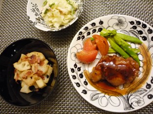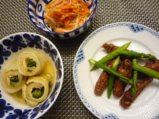 手羽中の甘辛揚げ&アスパラの素揚げ(てんきち母ちゃんレシピより)白菜と油揚げ、水菜のロール煮(若林三弥子の蒸しいため完全マスターより)にんじんとえのきのぺペロン風( 〃 ) * * * * * * * * * * * * *我が家の手羽中料理の中で、一番人気がコレ!片栗粉をまぶした手羽中をカリカリになるまで揚げ、バルサミコ酢やお醤油、水あめ、おろしにんにくなどを合わせて煮立てたたれに絡めます。カロリーはとっても高そうなおかずですが、文句ナシにおいしいーー。白菜と水菜は蒸しいためで加熱しておき、白菜と油揚げを重ね、中心に水菜を置いて巻き、だしや薄口醤油、みりんなどを合わせた煮汁で煮込みます。煮汁まで飲み干せる薄味の煮物です。にんじんとえのきも蒸しいためで火を通しておき、みじん切りのにんにくとざく切りのトマトを炒めて作った簡易トマトソースで和えています。お砂糖は加えていないのに、にんじんもトマトも甘く感じられます♪