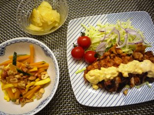 塩麹のチキン南蛮(塩麹&麹レシピより)かぼちゃとズッキーニのサラダ ナッツドレッシング(若林三弥子の蒸しいため完全マスターより)大根のカレーマリネ(有元葉子さんレシピ) * * * * * * * * * * * * *鶏のもも肉を塩麹に漬けておき、卵と小麦粉を合わせた衣をつけて1枚のまま揚げています。食べる時にもゆで卵と塩麹を合わせたタルタルソースをかけました。サラダは気に入ってリピートしているレシピ。蒸しいためしたかぼちゃとズッキーニにすし酢を回しかけ、そのまましばらく置いておきます。食べる時にオリーブオイルで炒め揚げしたナッツをオイルごとかけるので、ぐんとコクと食感がアップして、野菜だけのサラダも飽きずに食べられます。再びお昼ごはんを作る日々^^;今日は牛肉のダシで作ったスープでクッパにしました。おうちでカンタン!韓流ごはん(2)のレシピです。昨日から娘が熱を出し、しばらく引きこもり生活になりそう・・・。旅行の疲れが出たのかな。【送料無料】塩麹&麹レシピ基本的な塩麹を使ったレシピからプロの料理人の方の提案まで、バラエティに富んでいて活用のしがいがあります。醤油麹のレシピも。【送料無料】おうちでカンタン!韓流ごはん(2)