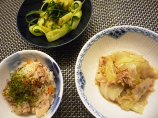 鶏肉と長芋の塩麹炊き込みご飯(麹と酒粕のおいしい食卓より)キャベツとツナの煮浸しなすときゅうりの冷製(たかこさんのしあわせふたりごはんより) * * * * * * * * * * * * *今日は夫だけキャンプに出掛けたので、母子3人の食卓。当初は夫と娘で行く予定だったのですが、病み上がりなので断念。他のメンバーは家族連れなのに気まずくないのだろうか・・・?と思いきや、ひとり用のテントを準備し、張り切って出掛けて行きました^^;息子は新人戦の真っ最中なので、テニス三昧の日々。部活の他に、友人とコートを取って自主練までしているので、全身真っ黒です炊き込みご飯の味付けは塩麹のみ。鶏肉の旨みが引き出されて、十分おいしかったです。キャベツの煮浸しは厚手のお鍋で蒸し煮にしています。ツナとお醤油、お砂糖で甘めの味付け。なすときゅうりの冷製は簡単でおいしいお気に入りのレシピ。皮をむいてレンジにかけ、冷やしておいたなすと、ピーラーで削ったきゅうりを合わせ、オリーブオイルと市販のポン酢を回しかけていただきます。本日のお昼ごはん。かつおのお刺身を買ったので、コチュジャンやお醤油に漬け、生卵をのせて、ユッケ丼にしました。長芋との相性もバッチリレシピではさらにオクラものせていましたが、ゆでた豆苗で代用しました。おうちでカンタン!韓流ごはん(2)のレシピです。和風の漬け丼はよく作りますが、こういうタイプの漬けは初めて。予想以上においしくて、フツーのかつおのお刺身がグレードアップできました♪