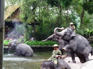 二日目はSingapore Zooへ。こちらの動物園は柵などが一切なく、自然の中を散策する感じで動物を見ることができます。厳密には動物エリアの回りにはお堀がほってあって、さりげなく見物エリアと区切られているのですが、柵やガラス板がないだけで、とても自然な状態に感じられました♪画像はアジアゾウのショータイム。アフリカゾウよりも小さめですが、なかなか賢い!水を吹いたり、丸太を運んだりいろいろ見せてくれました(*^_^*)見ている間もとにかく暑かったので、持参した扇子であおいでいたのですが、前に座っていた欧米系の子供に珍しそうにガン見されました^^;扇子って日本のお土産としてもよく見かけるし、けっこうメジャーになっているのかと思ったのですが、まだまだ知らない人も多いのかな~?ゾウに乗ってお散歩することができたのですが、高所恐怖症の息子は断固拒否!確かに小さめのゾウとはいえ、背中に乗るとなると結構な高さがありました^^;こちらでも人気者だったオラウータン。旭山動物園のように、自由に空中を散歩してますちょいちょい人の目を意識しつつも、マイペースで自由な感じがなんとも癒される~。立派なホワイトタイガー。これはさすがにアクリル板越しでしたが、迫力満点キリンたちも広いスペースを自由に動き回っていました。敷地が広い動物園なので、動物たちが囲われているという感じがまったくしなくて、のびのびとしているように感じられました。ただ、見るほうは広くてホントに大変暑いし、足は痛いし、途中スコールは降るしで、なかなかハードでした(>_