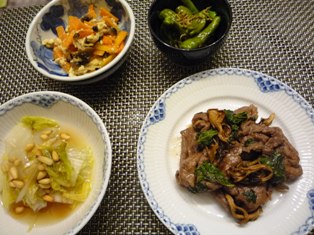 牛肉と大葉のバター醤油炒め(有元葉子さんレシピより)白菜の蒸しいため 松の実オイルがけ(若林三弥子の蒸しいため完全マスターより)にんじんとしめじの白和え( 〃 )ししとうとじゃこのきんぴら * * * * * * * * * * * * *牛肉をバターでさっと炒め、お醤油を回しかけ、仕上げにちぎった大葉を20枚加えます。大葉の香りがさわやかで、夏向きの味。さらに、あっという間にできるので、火のそばに長くいたくない夏にはぴったり。白菜の蒸しいためは前回家族(特に娘)にもとても好評だったので、さっそくリピート。ごま油で炒めた松の実をオイルごとソース代わりにかけています。味付けは塩のみ。それでも白菜の甘みがしっかり出ているので美味白和えも同様に蒸しいためで調理しました。水切りしたお豆腐も一緒にお鍋に入れてしまうので、とても簡単。隠し味に白味噌で味を締めています。あとは薄口醤油とすりごま。にんじんが甘くてたっぷり食べられました♪今日のお昼ごはんは、少~し気分を変えて、明太子と切りもちのお好み焼き。枝元なほみの一番やさしい!米粉レシピを参考にしました。米粉と卵で作った生地に、明太子としゃぶしゃぶ餅、チーズ、ニラを加えて焼きます。仕上げはお醤油とかつおぶし。意外な組み合わせですが、おいしくいただきましたお好み焼き1種類だと飽きそうだったので、お焼きも作りました。昨日息子用に作った牛ごぼう丼の残りのきんぴらを細かく刻み、米粉と豆腐で作った生地で包んでフライパンで焼き色をつけています。