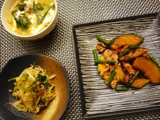 かぼちゃと豚肉のコチュジャン炒め(藤原さんちの毎日ごはんより)ほうれん草と大根、もやしのナムル(若林三弥子の蒸しいため完全マスターより)あさりと豆腐のチゲ(おうちでカンタン!韓流ごはん(2)より) * * * * * * * * * * * * *かぼちゃを蒸しいためしておき、豚肉と合わせて炒めて、コチュジャン、オイスターソースなどで甘辛く味付け。かぼちゃがたっぷり食べられるレシピです。なすを足してもよさそう♪蒸しいためした野菜で作ったナムル。この方法ではほうれん草はあく抜きせずにそのままです。不思議とえぐみもなく、味が濃くておいしい!