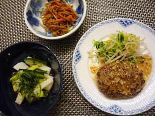 塩麹ハンバーグ(塩麹&麹レシピより)もやしと豆苗のソテーごぼうとにんじんの醤油麹きんぴら( 〃 )長芋とズッキーニの蒸しいため(若林三弥子の蒸しいため完全マスターより) * * * * * * * * * * * * *合挽き肉に塩麹と生の玉ねぎを加えただけのハンバーグだねです。塩麹を加えると分離してくるので、たねを作ったらすぐ焼かないといけません^_^;ちょっと割れてしまいましたが、つなぎなしでも一応まとまりました。シンプルなたねなので、ちょっといいお肉で作った方がよさそうです醤油麹きんぴらは初めて作りました。味付けは本当に醤油麹のみ。塩麹よりも塩分が少ないので、思い切って入れないと味が薄くなりますが、それだけで味が決まるのはラクチンでよかったです。このところ愛用している蒸しいため本。長芋とズッキーニの組み合わせも気に入ってリピートしています。食べる時に大葉の千切りとポン酢をかけてさっぱりと。夏向きのおかずです【送料無料】塩麹&麹レシピ【送料無料】若林三弥子の蒸しいため完全マスター [ 若林三弥子 ]