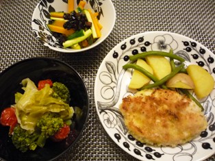 鶏むね肉のバジル風味ソテーじゃがいもといんげんのオリーブオイル蒸しキャベツとプチトマト、ブロッコリーの蒸しいため(若林三弥子の蒸しいため完全マスター より)ズッキーニとかぼちゃのナッツサラダ( 〃 ) * * * * * * * * * * * * *鶏むね肉を観音開きにして、市販のバジルペーストをはさみ、パン粉をまぶしてオリーブオイルでソテーしています。バジルペースト効果でむね肉でもしっとりした仕上がり。じゃがいもと冷凍いんげんは厚手の鍋で少量の水とオリーブオイル、塩を加えて加熱する蒸しいための調理法を使いました。サラダ2品はいずれも蒸しいためレシピ。薄味でもおいしく、加熱時間も短くて済むので、この夏大活躍のレシピ本ですキャベツのほうは、オリーブオイルとおろしにんにくと塩のみ。ズッキーニは蒸しいためした後、仕上げにカシューナッツ、くるみ、アーモンドをオリーブオイルで炒めたナッツのソースをかけて仕上げています。ナッツのコクが効いているので、薄味でもOK。今日のお昼ごはん。トマトと鶏ささみの卵とじ丼です。蒸しいためしたトマトと鶏ささみを薄味で調味し、卵でとじています。奥の牛ごぼうどんぶりは、トマト味がイマイチ好みではない息子用。キムチをのせた冷奴と一緒にいただきました♪【送料無料】若林三弥子の蒸しいため完全マスター [ 若林三弥子 ]