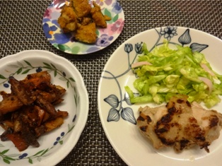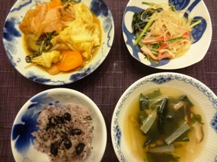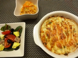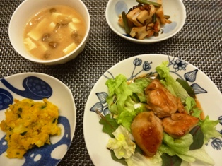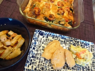鶏むね肉の甘酢焼きかぼちゃとじゃがいもの味噌マヨサラダれんこんと塩昆布の梅きんぴら お豆腐となめこの味噌汁 * * * * * * * * * * * * * ドライトマトとブラックオリーブのペペロンチーノ大根とかにかまのごまマヨサラダ * * * * * * * * * * * * *