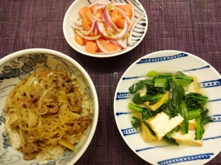 ごぼう入り牛丼小松菜と厚揚げの煮びたしトマトと紫玉ねぎの甘酢漬け * * * * * * * * * * * * *