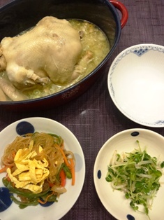 参鶏湯チャプチェもやしと豆苗、じゃこのゴマ醤和え * * * * * * * * * * * * * 久しぶりに丸鶏を買ったので、参鶏湯に。お腹にはもち米、なつめ、クコの実、生姜、そして、甘栗代わりの黒豆の甘煮が入っています♪ 小鉢は、最近お気に入りの福山さんプロデュースの調味料シリーズの「ゴマ醤」で味付け(*^_^*) ちょっとグロテスクですが、こんな感じに仕上がります♪スープに小口切りにしたネギがたっぷり。 参鶏湯の調味料は塩のみ。それでも鶏から美味しいスープが出るので、薄味でもしっかり旨みがあります。
