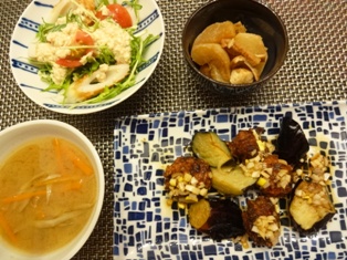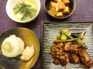 いわしのつみれ揚げかぶと椎茸のえび詰め煮厚揚げのごま豆板醤煮 お豆腐とわかめのお味噌汁 * * * * * * * * * * * * *