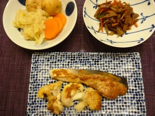 ぶりの梅みそ焼き&カリフラワー牛ごぼうきんぴら白菜とがんもどき、にんじんの煮物 * * * * * * * * * * * * *