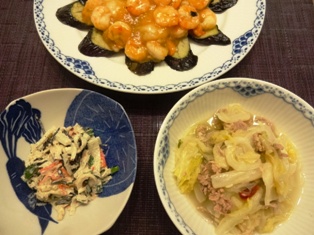 餅入り海老チリソース&揚げナス白菜と豚肉の煮込み大根とひじき、かにかまのごまマヨ和え コストコの海老は殻も背わたも取ってあり、すぐに使えてとても便利。そして冷凍なのに味も食感もバッチリ!海鮮類があまり得意でない我が家の子どもたちも、コストコの海老だとよく食べます♪