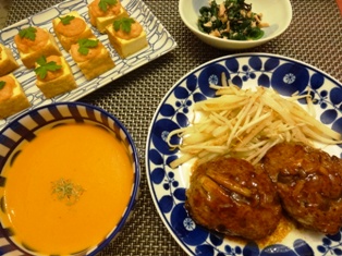 きのこ入り和風ハンバーグ はちみつ生姜ソース にんじんとトマトのポタージュ厚揚げの明太子チーズ詰め焼きほうれん草とツナの塩レモン和え * * * * * * * * * * * * * 本日のヒットはにんじんとトマトのポタージュ クックパッドの大好評レシピ 本当においしいBEST100のレシピ。にんじんのポタージュにトマトペーストを加えるのは作っていたのですが、いつでも家にあるトマト水煮缶で出来るところがポイント ストウブのお鍋で野菜の甘みを引き出しつつ煮込むと、コンソメの素がいらないくらい美味でした~♪ ブラックオリーブの特大瓶詰めを買ったので、せっせと使っています。 パンに混ぜ込みました。 おいしいオリーブオイルと岩塩で。 駅ナカで見かけた期間限定出店のお店にて衝動買い。あまおうを使ったイチゴ大福(//´艸`//)*:..。oお値段、ひとつ410円なりもちろん、おいしかったけれど、あまおうはイチゴ大福でなくてもいいかな~^^; e‐MOOK【後払いOK】【1000円以上送料無料】クックパッドの大好評レシピ 本当においしいBEST100 ふらりと立ち寄った本屋さんで手にとって、思わず購入。ネットでも検索できますが、クックパッドも珠玉混合なので、こうしてピックアップされているものはやはりハズレが少ない気がします。作ってみたいレシピがたくさん!